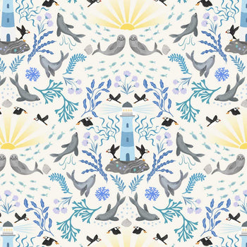 Puffin Rock is a whimsical costal themed collection featuring adorably friendly seals and puffins on bright quilting cottons.