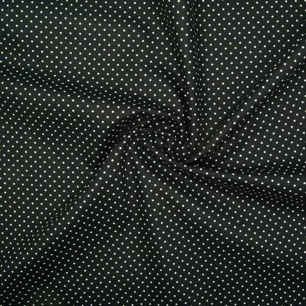 A lovely quality 100% cotton fabric with 2mm white pin spots on a black background. This cotton fabric is suitable for dressmaking, crafting, quilting and general use.