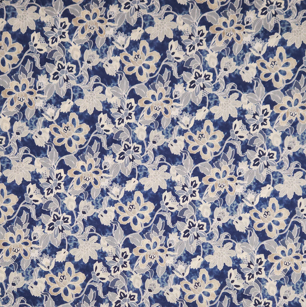 A gorgeous design of bold cream flower outlines and vines, sprouting across a contrasting navy pima cotton lawn fabric.
