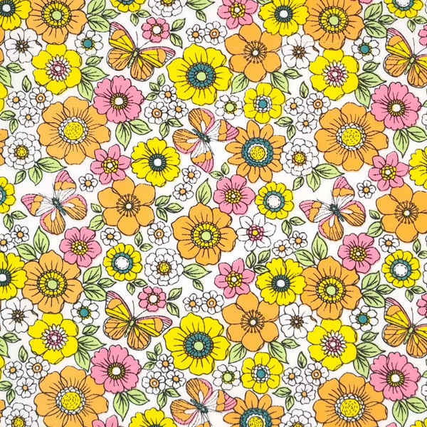 Beautiful butterflies and colourful flowers are printed on a white polycotton fabric. Ideal for your spring/summer sewing projects!