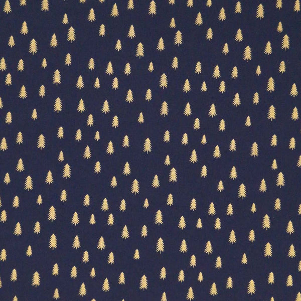 Add a joyful sparkle to your holiday projects with this festive cotton fabric, adorned with tiny gold metallic trees on a navy background. Its lightweight and breathable material is ideal for crafting Christmas decorations, stockings, and gifts that capture the magic of the season.