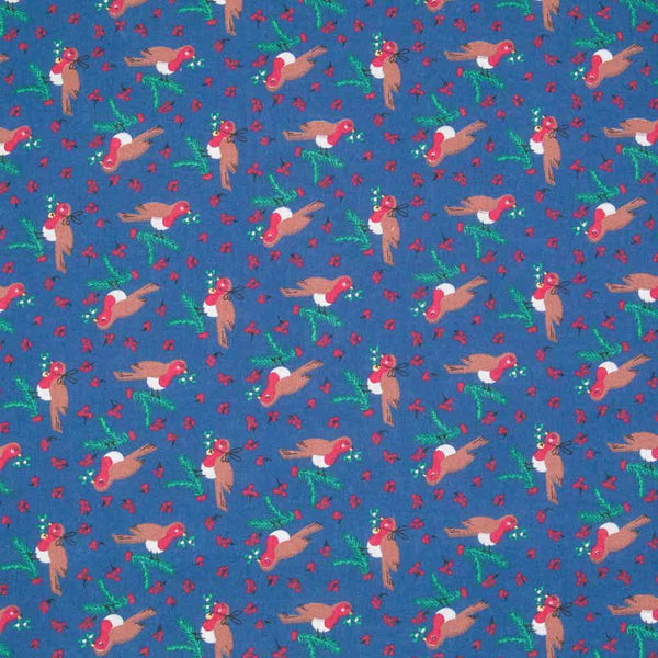 A festive robin holding a piece of mistletoe, sitting on a delicate branch of holly printed on a navy polycotton fabric. Perfect for many Christmas craft projects.