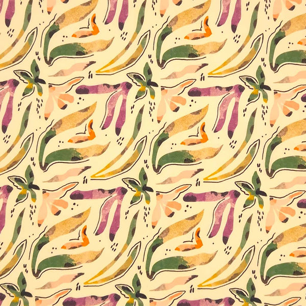 A beautiful abstract viscose dressmaking fabric featuring floral shapes of leaves and petals, painted various shades of green, purple and pink. The contrasting cream background makes this and ideal fabric for your colourful summer crafts.