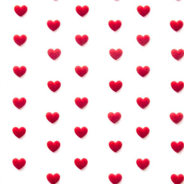 Brighten your creations with this charming polycotton fabric featuring a delightful mini design of crochet-style cerise hearts printed on a crisp white background.