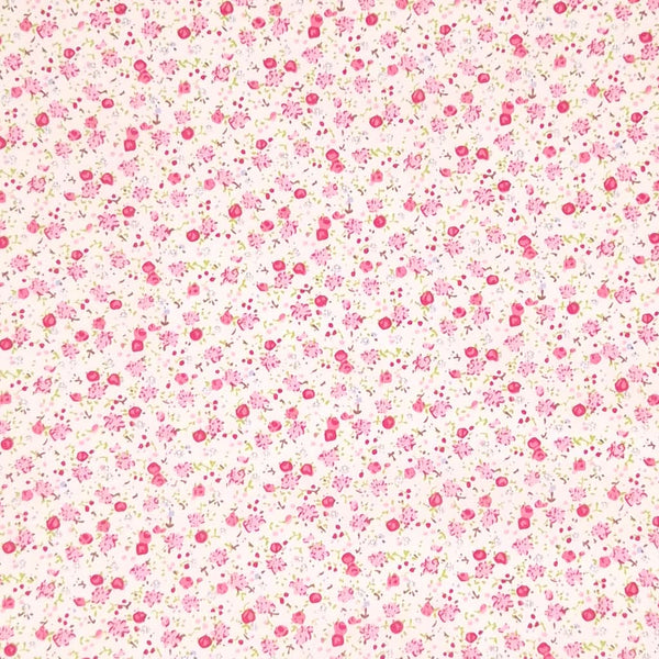 A pretty, ditsy pink flower printed on a cream polycotton fabric.