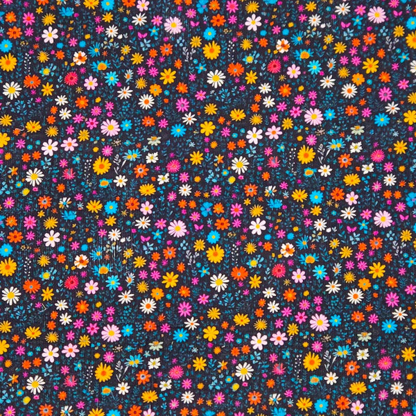 Ditsy Flowers Cotton Needlecord is a pretty corduroy fabric perfect for dressmaking and soft furnishings. Its bright, ditsy floral pattern adds a playful touch, while the soft, textured needlecord provides durability and comfort. Ideal for creating stylish dresses, cushions, or home décor, this fabric combines practicality with a jolly vibe.