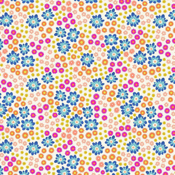 A bright and colourful design featuring varied size flowers composed of spots and dots, printed on a contrasting cream, 100% cotton fabric. Memorisable and bright for any stand-out summer crafts.
