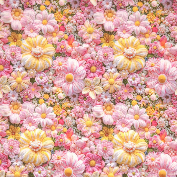 Pink and lemon flowers in a 3D design printed to appear embroidered, on a quality 100% cotton fabric; ideal for most sewing and dressmaking projects.