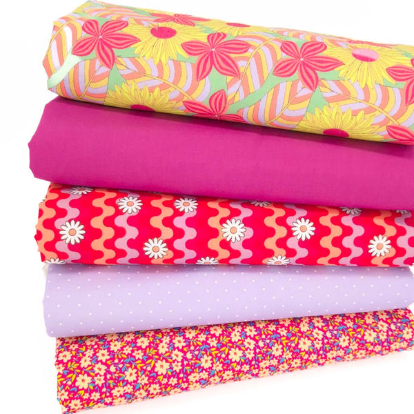 A fat quarter bundle featuring a retro selection of 5 polycotton floral fabrics in magenta, orange and lilac colours.