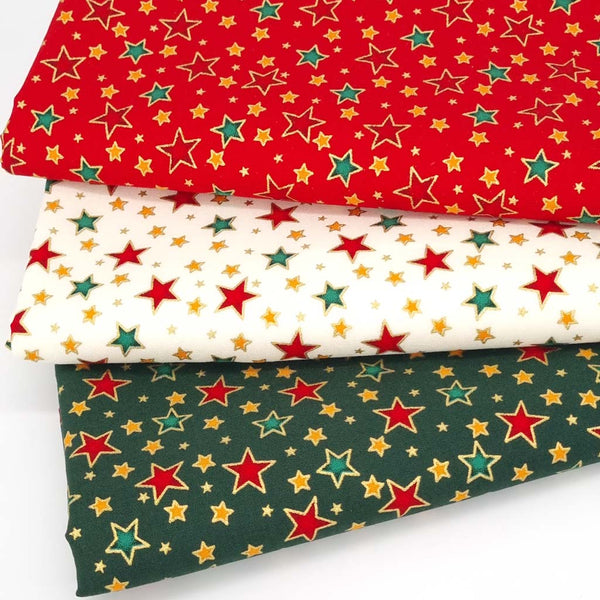 This is a traditional festive bundle of 3 cotton fabrics with gold metallic design features. The prints include festive stars in red, green and ivory colourways. Perfect for many christmas crafting projects.