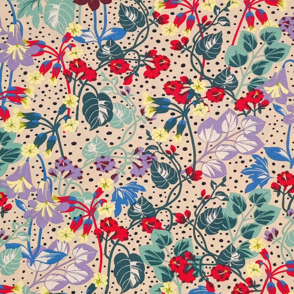 This beautiful viscose is printed with a floral and spots design on a sand coloured background.