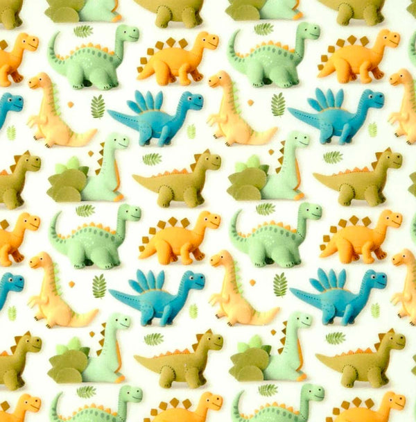 This 3D fabric showcasing adorable pastel-coloured smiley cartoon dinosaurs trotting, sitting, and lounging among rocks and leaves, adds a joyful, whimsical touch to any creation.