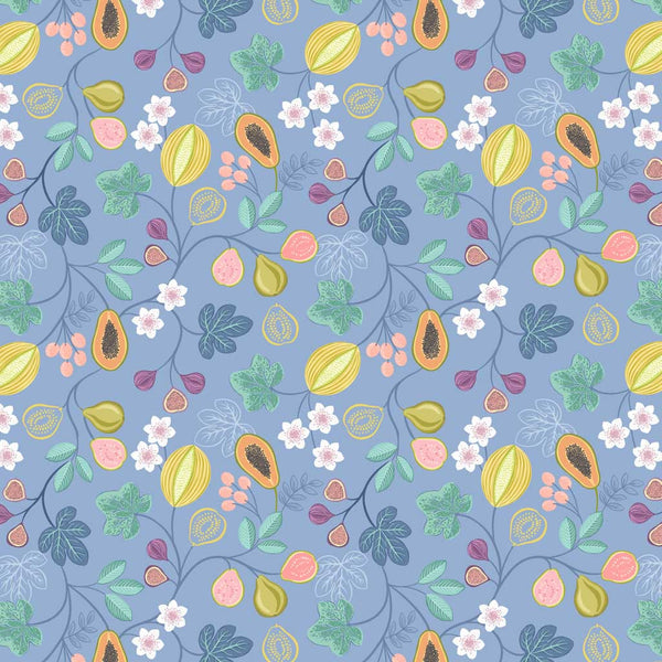 Bright branches of tropical papaya, figs, melon and pear surrounded by colourful flora printed on a deep Atlantic blue quilting cotton.