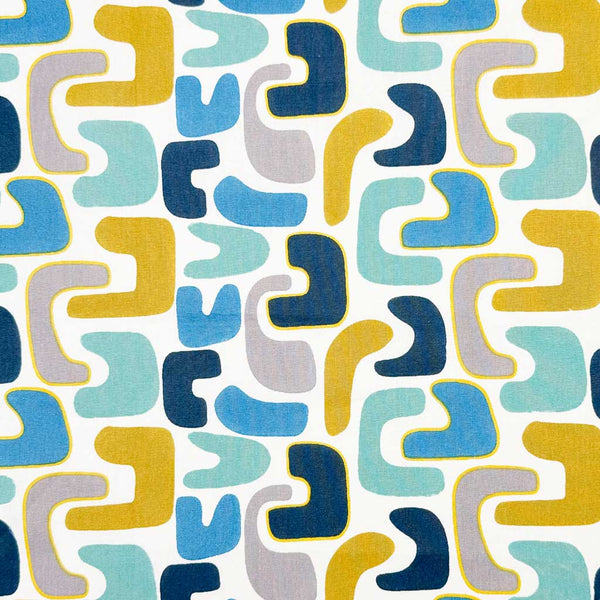 A design featuring fun and abstract shapes of blue and yellow on a contrasting, bold white background printed on an 100% cotton fabric; ideal for most sewing and dressmaking projects.