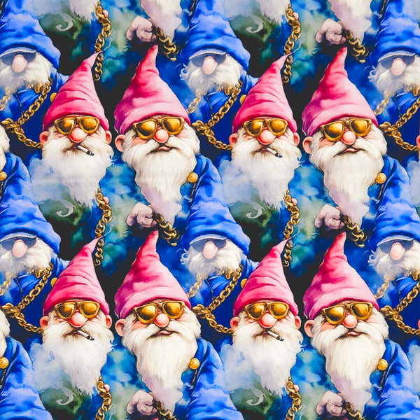 This cotton fabric features gnomes sporting cool gold glasses and chains, perfect for adding a fun, quirky vibe to your creations. OEKO TEX Certified.