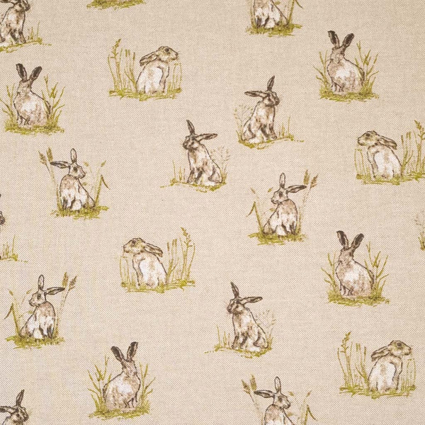 Hares in springtime printed on a cotton rich, linen look craft canvas fabric.