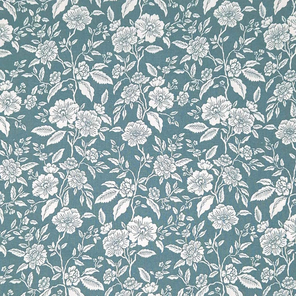 A beautiful and intricate design of white outlined roses, printed on a rich blue 100% cotton fabric; ideal for most sewing and dressmaking projects.