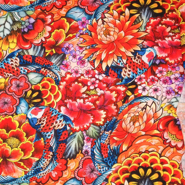 This stunning oriental print features florals and koi carp printed on a woven viscose fabric.