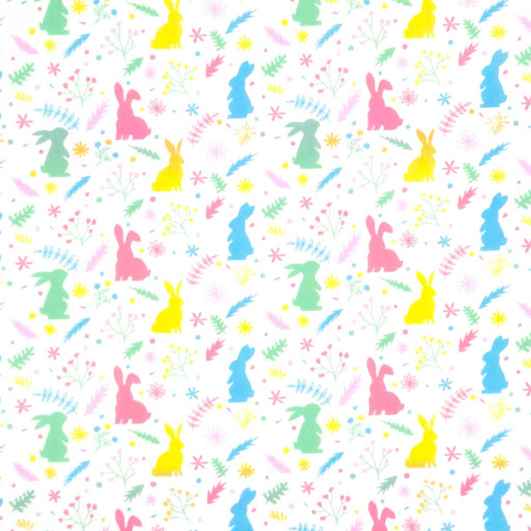 A beautiful design featuring bunny outlines and floral scenery on bright spring colours of pink, blue, green and yellow on a white polycotton fabric.