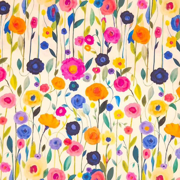 This gorgeous floral viscose features delicately painted multicoloured wildflowers on a light cream dressmaking fabric. Both colourful and bright, ready for your crafty creations.