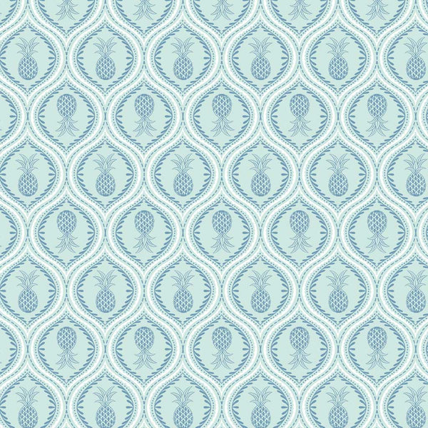 Gorgeous pineapples in mandala-like tear drops of navy are printed on a light lagoon blue quilting cotton.
