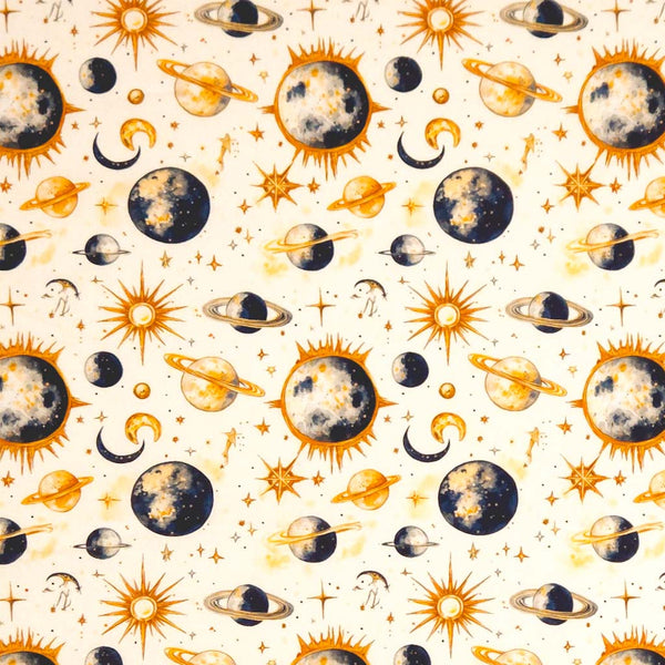 This gorgeous cotton fabric showcases an astronomical design with glowing planets, shining stars, and twinkling moons in deep navy and radiant gold tones.