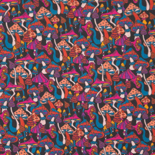 100% cotton corduroy features a vibrant design of intertwining mushrooms in retro colours on a plain black background by Little Johnny.