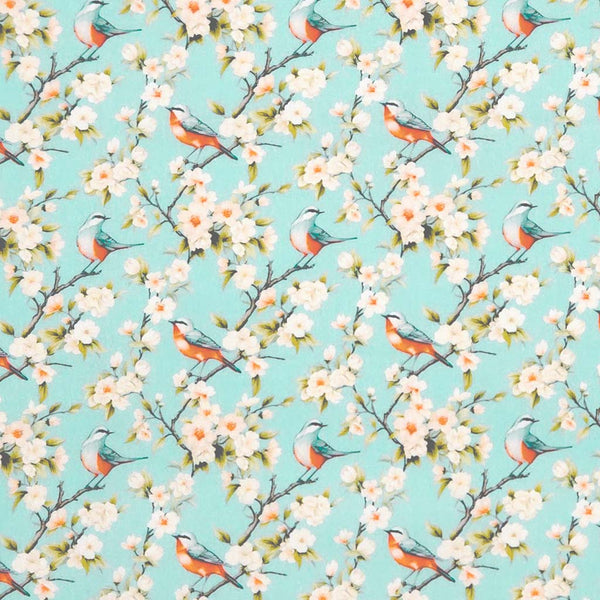 A beautiful spring design featuring bright birds resting among blooming blossom branches on a sky blue cotton poplin fabric. This pretty Rose & Hubble ditsy floral design is a soft, fine weave poplin; suitable for crafting, dressmaking, quilting and general use.