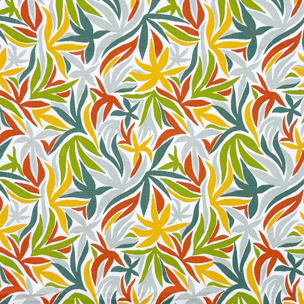 A fun and colourful print of multicoloured leaves on a contrasting white background; printed on a 100% cotton fabric; ideal for most sewing and dressmaking projects.