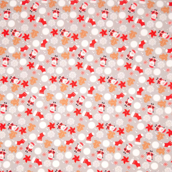 Santa, Snowball & Stockings - Silver - Christmas Polycotton