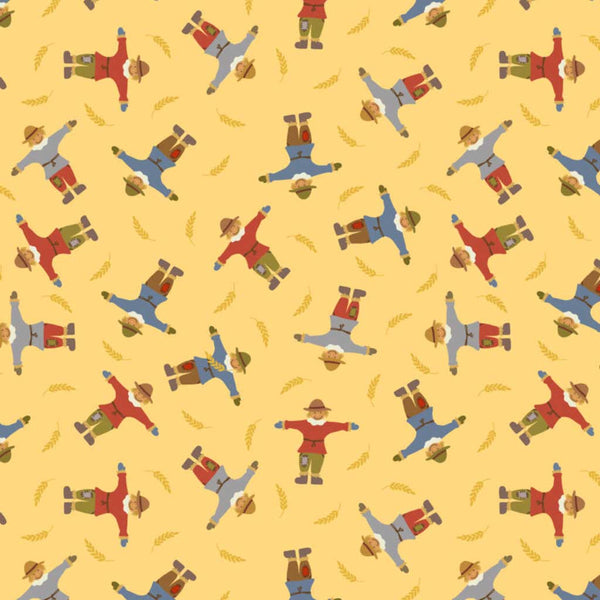 This vibrant quilting fabric features cheerful scarecrows in bright jumpers surrounded by golden cornfields, printed on a warm harvest yellow fabric.