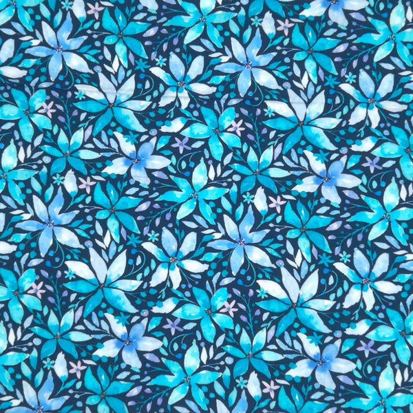 This beautifully blue design features ombre petal flowers surrounded by swirling vines and leaves on a navy viscose dressmaking fabric.