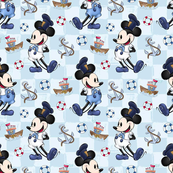 A fun and beautiful fabric featuring Steamboat Willie in a white captain uniform, surrounded by anchors', boats and rubber rings on a checked blue background. Printed on a premium 200 thread-count percale 100% cotton fabric; ideal for most sewing and dressmaking projects.