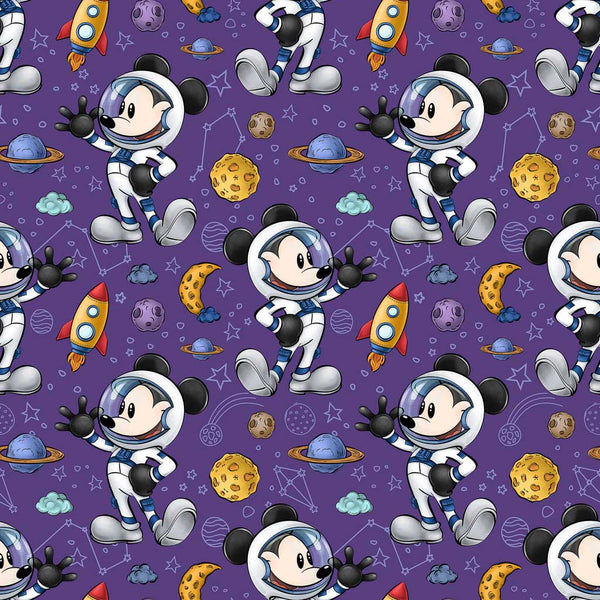 A fun and bright fabric featuring steamboat willie on his space adventures, surrounded by planets, stars and spaceships of a deep purple background. Printed on a premium 200 thread-count percale 100% cotton fabric; ideal for most sewing and dressmaking projects.