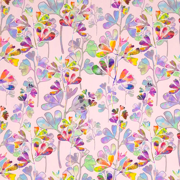 Beautifully bright, metallic coloured flower vines printed on a pink 100% digital cotton fabric by Little Johnny.