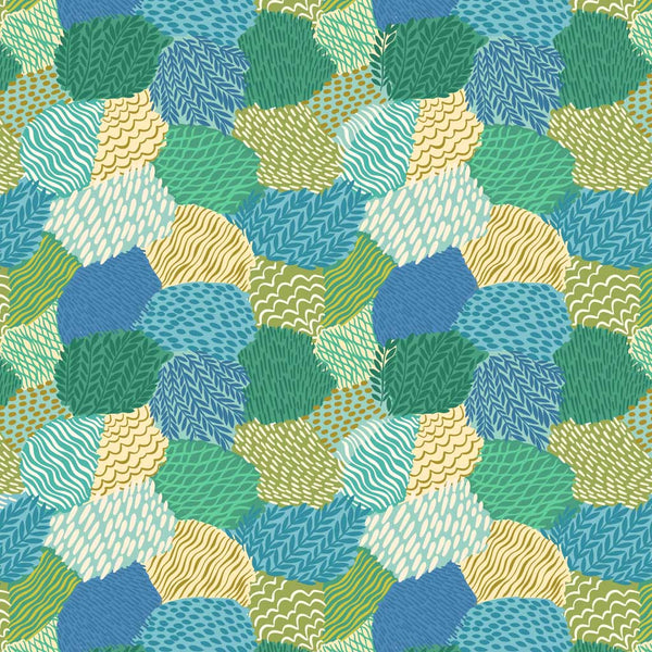 A gorgeous, bright fabric featuring patchwork of textured spots, swirls, lines and vines in beautifully blending shades of blues and greens; printed on an 100% cotton fabric, perfect for an eye-catching creation.