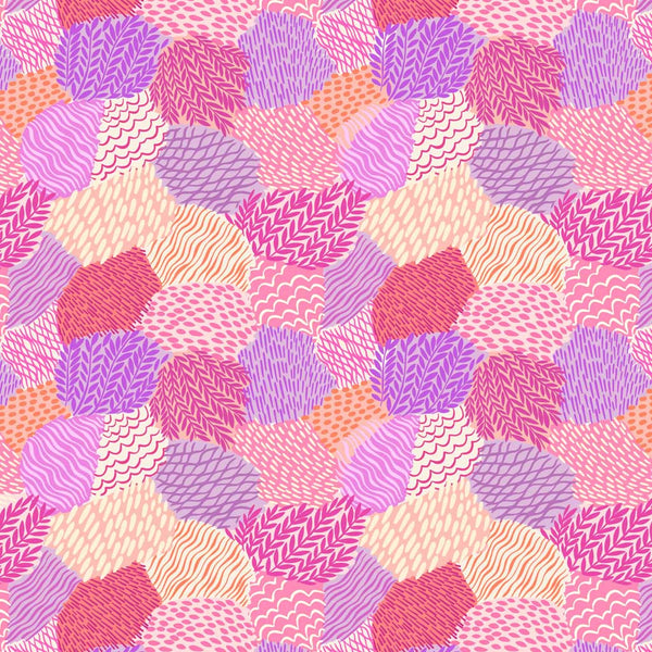 A gorgeous, bright fabric featuring patchwork of textured spots, swirls, lines and vines in beautifully blending shades of pinks and purples; printed on an 100% cotton fabric, perfect for an eye-catching creation.