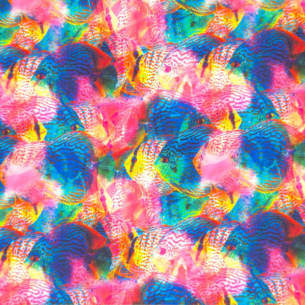 A vibrant and fun tropical fish design printed on a viscose dressmaking fabric.