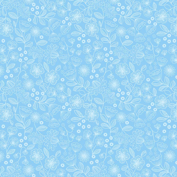 This beautifully delicate design features white outlined wildflowers and shaded white spots blooming across an aqua blue 100% cotton fabric. Perfect for all your crafting.