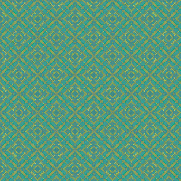 Vintage Olivine is part of the Kaleidoscope collection, inspired by the playful shapes and colors generated by the vintage toy. The collection celebrates the perfectly imperfect patterns created by light as it passes through bits of colored glass and is reflected by the object's internal mirrors. The sixteen-print collection features bold, geometric designs of varied scales and richly textured blenders that hit every note on the colour spectrum.