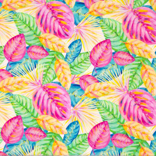 Detailed fan leaves in vibrant summer shades of pink, yellow, green and blue printed on a butter yellow linen mix dressmaking fabric.