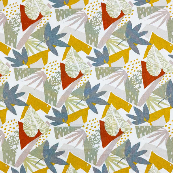 A bright, abstract design of leaves in bold red, blue and yellow on a contrasting background of greys; printed on a 100% cotton fabric; ideal for most sewing and dressmaking projects.
