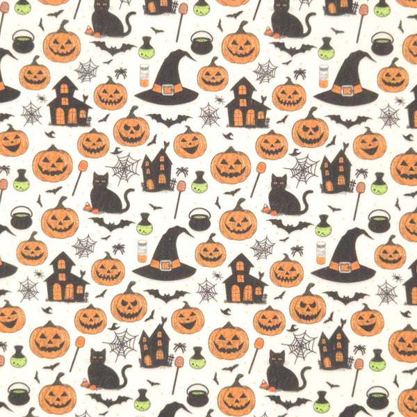 Add some spooky charm to your crafts with this cream polycotton fabric featuring playful witch hats, mysterious black cats, and cheerful pumpkins. Perfect for halloween crafts and costumes.