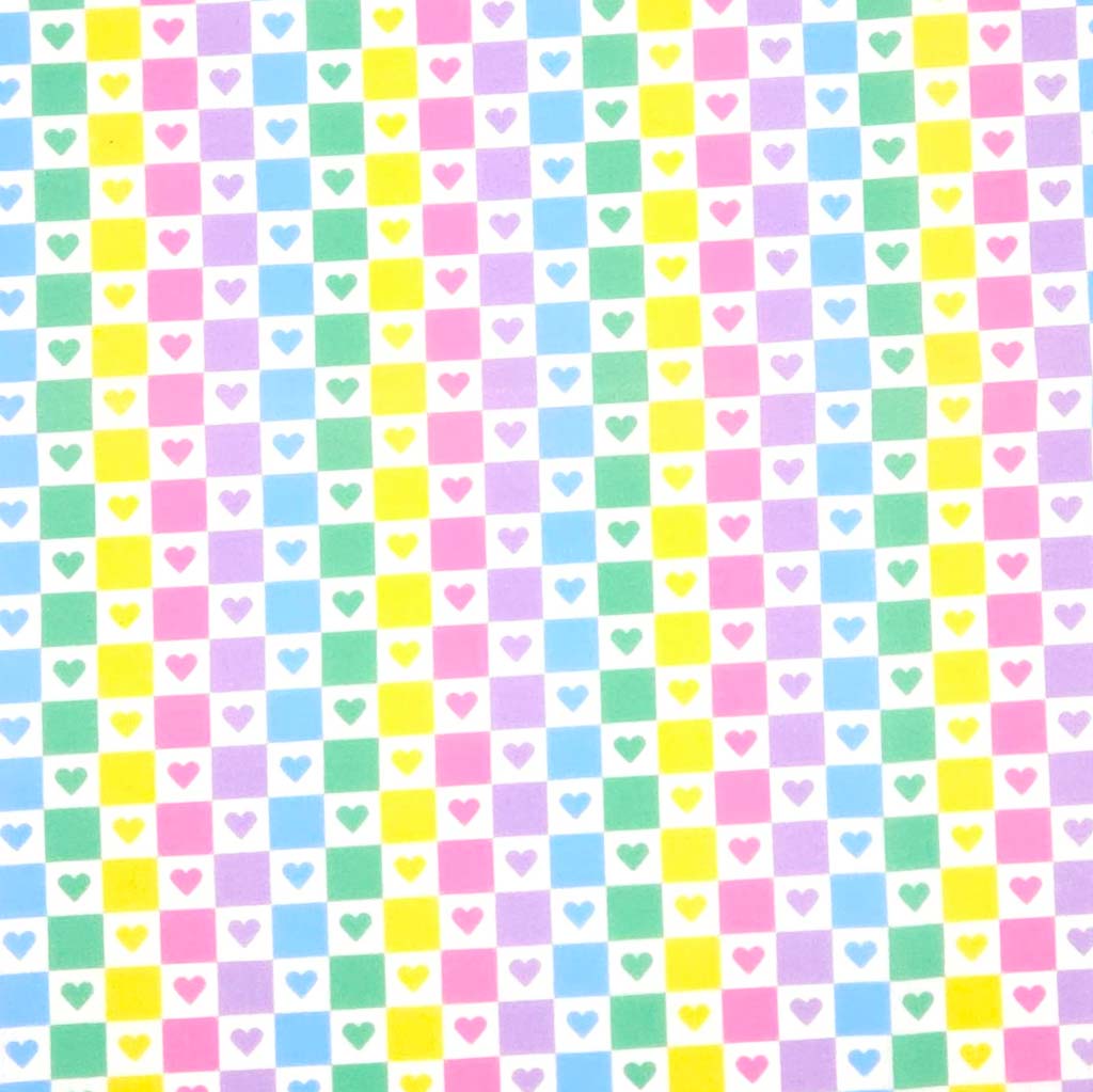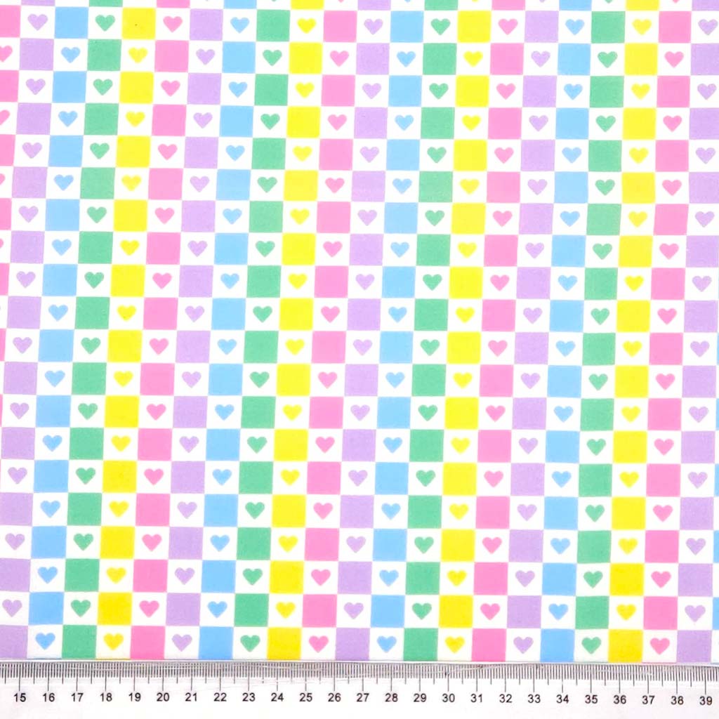 A gorgeous pattern of pastel rainbow check and mini hearts on a white polycotton fabric.