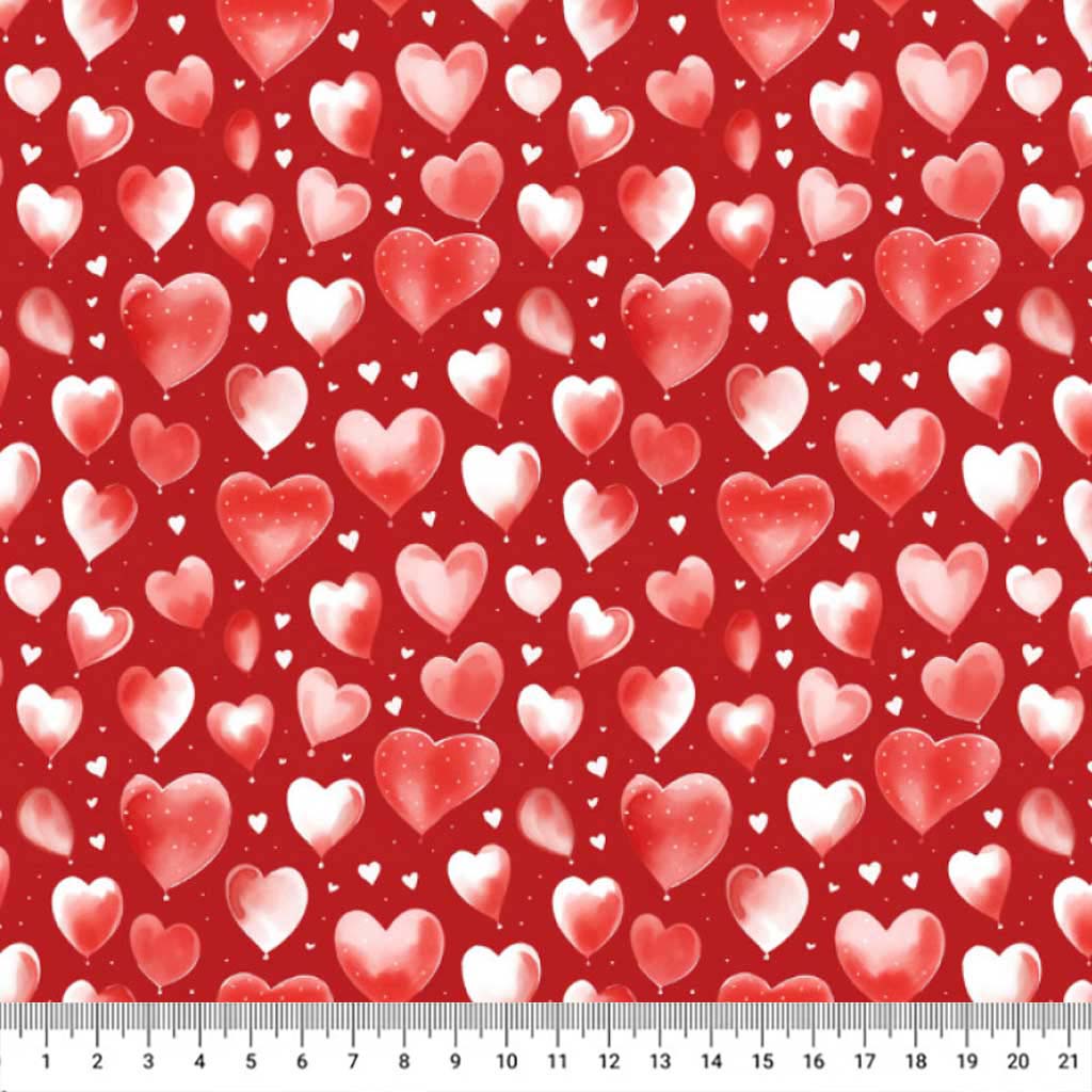 Celebrate love with this stunning digitally printed polycotton fabric, featuring watercolour-filled abstract hearts in vibrant red and white set against a rich deep red background. Perfect for your valentine crafts!