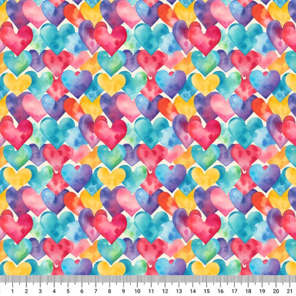 Celebrate love and joy with this vibrant polycotton fabric featuring overlapping watercolour hearts in a stunning rainbow of shades. Each heart bleeds softly into the next, creating a playful, artistic design.