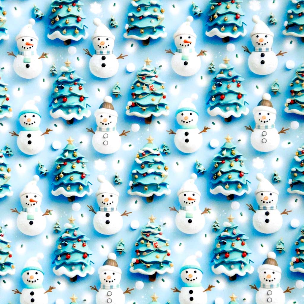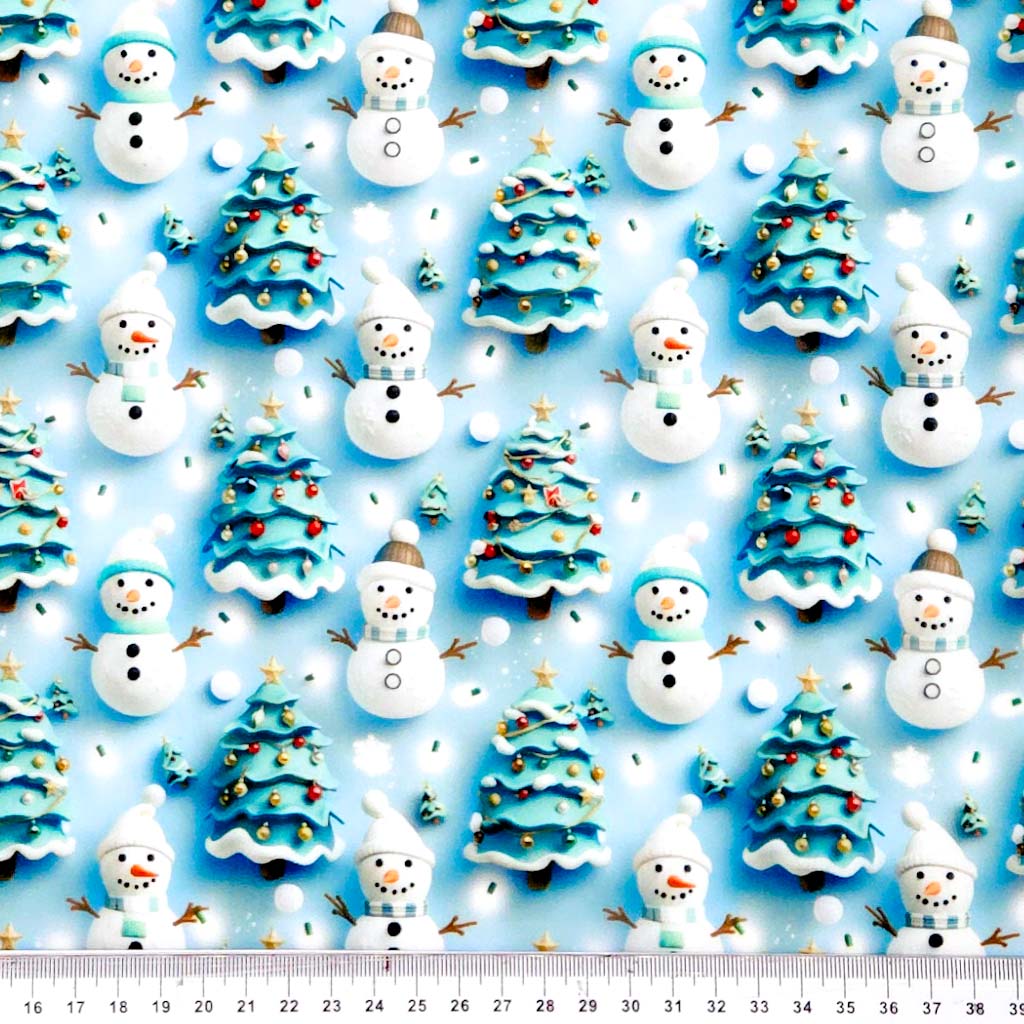 This playful 3D Christmas polycotton fabric features cheerful snowmen and snowballs surrounded by decorated Christmas trees, digitally printed for vibrant detail.