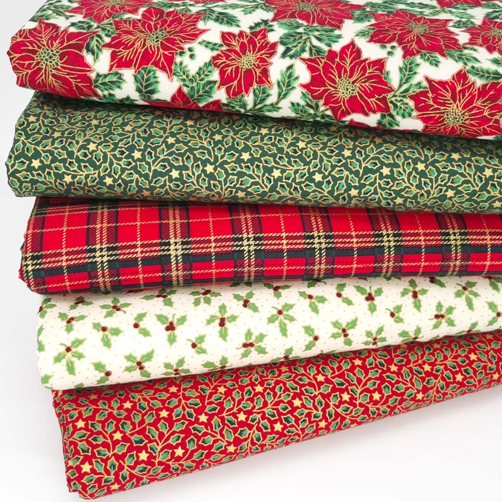 A traditional festive bundle of 5 cotton fabrics with gold metallic design features. The prints include a festive poinsettia flower, mini holly leaf with stars and a red and green tartan which also has metallic gold detail. Perfect for many christmas crafting projects.