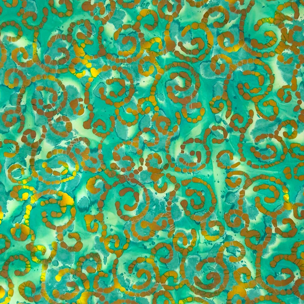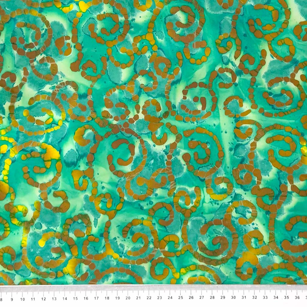 This cotton batik showcases jewelled tones in a mesmerising design of dotted gold coils swirling across a twinkling emerald background. The fabric's bright sophistication complements the skin beautifully, making it ideal for dressmaking projects and craft pieces that are simply timeless.