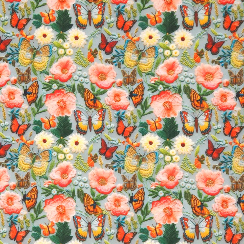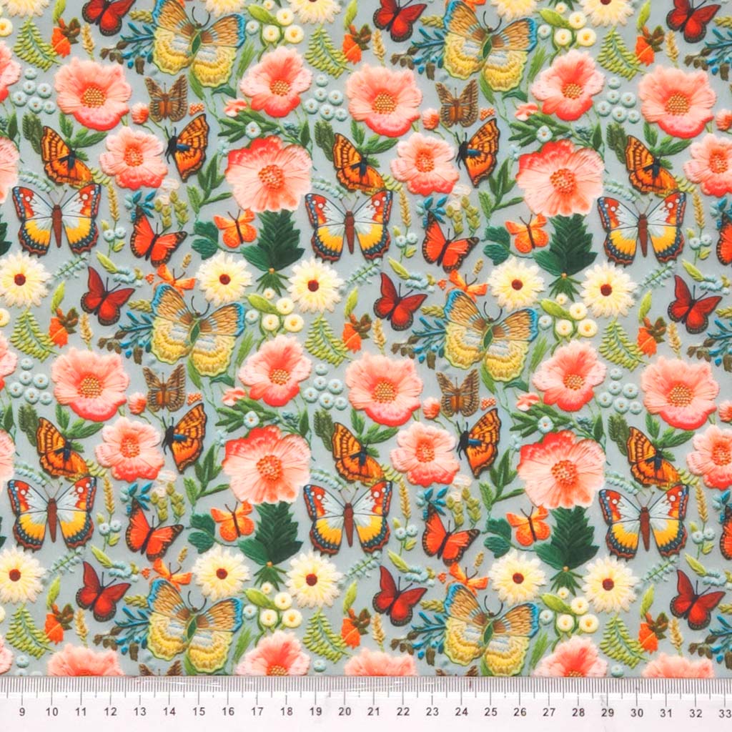 This stunning polycotton fabric features gorgeous 3D pink flowers and lush green leaves dancing across a vibrant blue background. Intricate orange butterflies flutter throughout the design, adding movement and charm to every project.